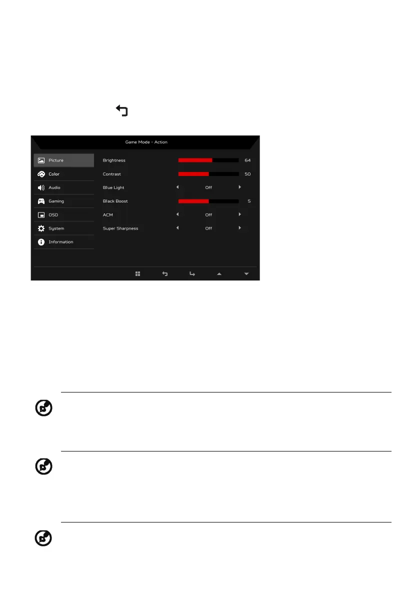 Open the Function page to select Picture, Color, Audio, Gaming, OSD or
