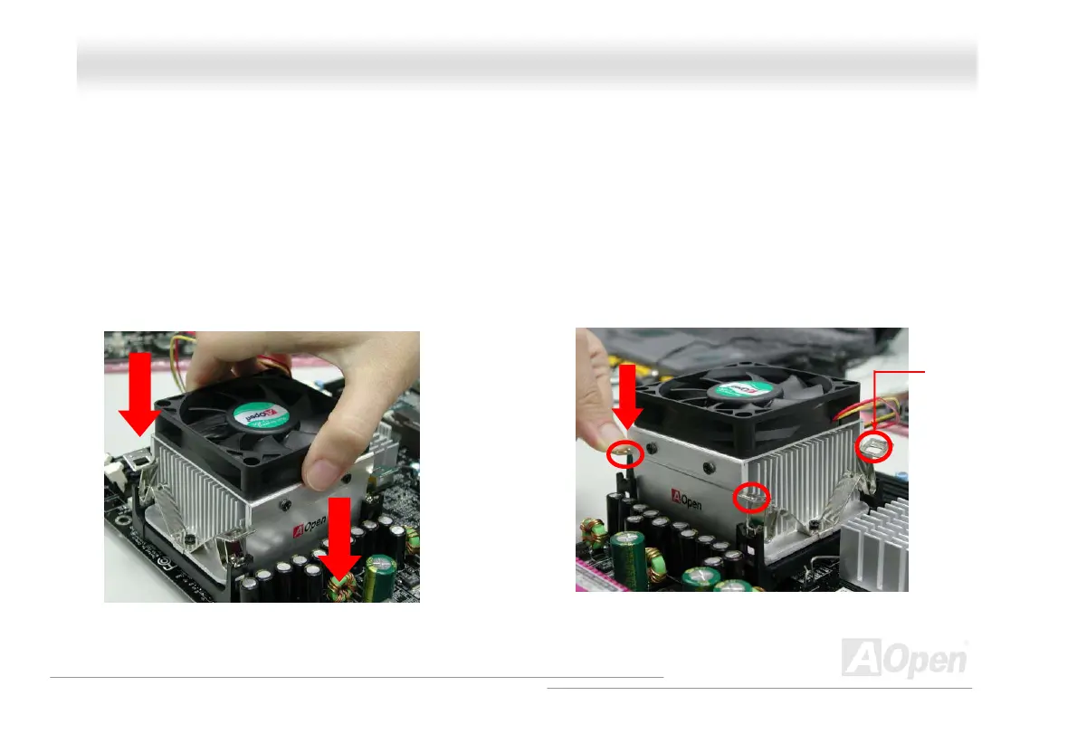 AOpen special designed CPU Fan as shown below on the retention module for better heat dissipation. Please install the CPU Fan