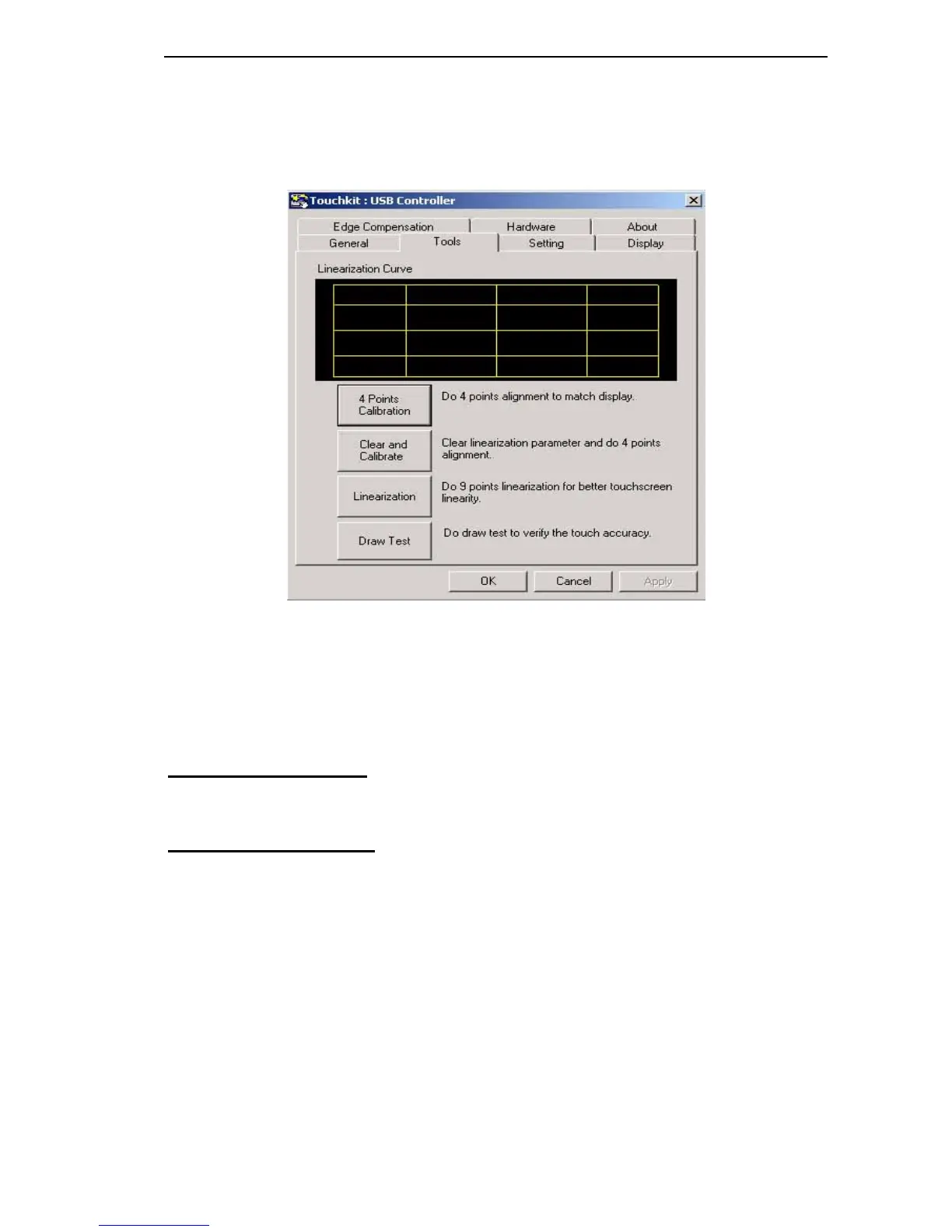 Calibration, draw test tools and the linearity curve of the touchscreen were