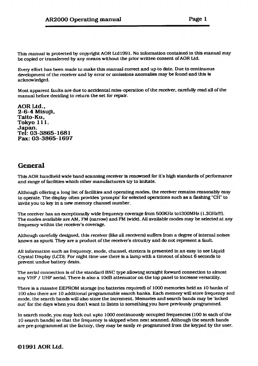 AOR AR2000 - General Receiver Overview; Receiver Features and Performance; Frequency Coverage and Receiving Modes; Memory and Search Bank Capacity