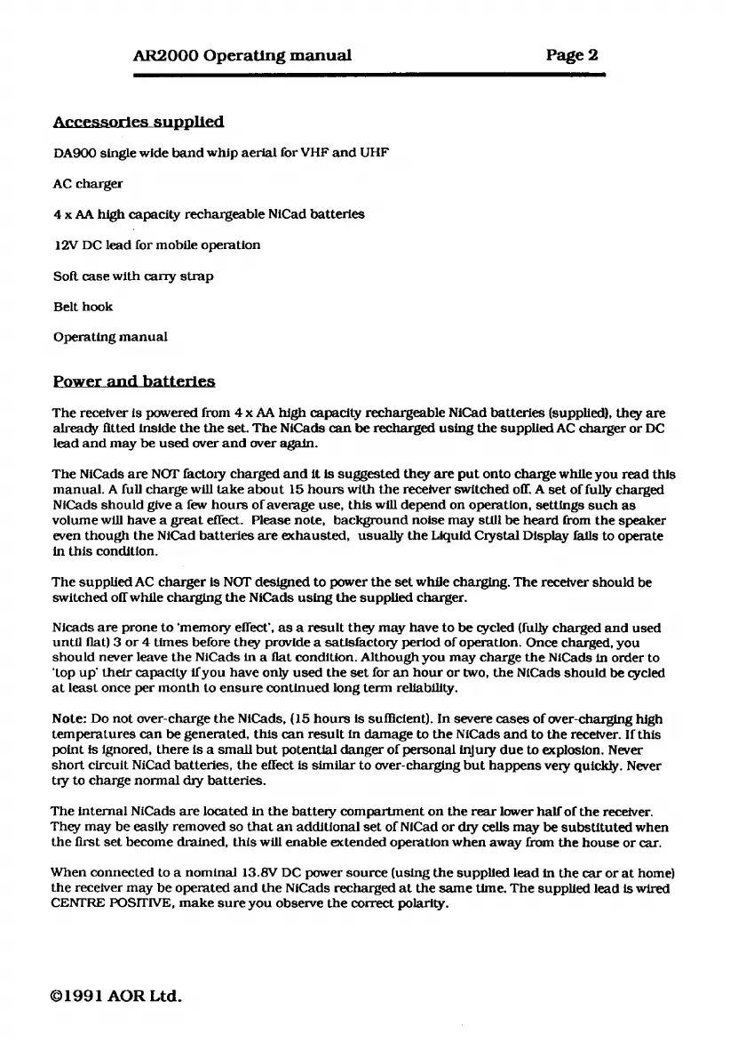 AOR AR2000 - Power and Battery Management; Battery Operation and Charging; Battery Care and Potential Hazards; External Power Connection