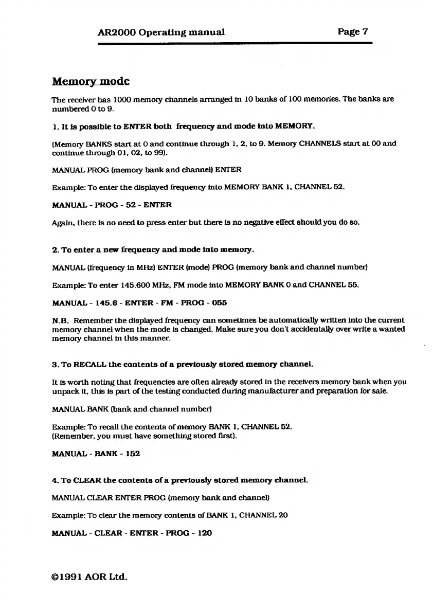 AOR AR2000 - Memory Channel Management; Entering and Storing Memories; Recalling and Clearing Stored Memories