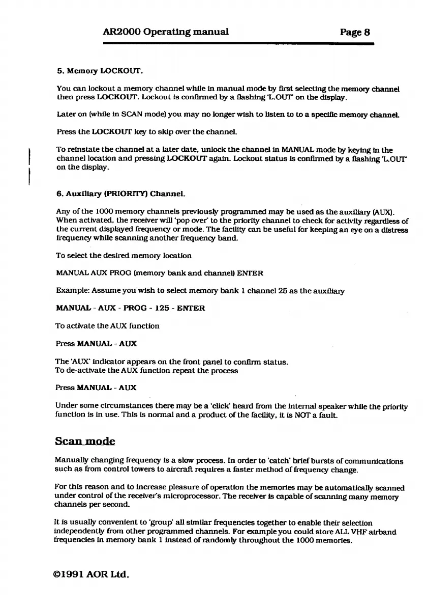 AOR AR2000 - Memory Lockout and Auxiliary Channel; Scanning Operations; Introduction to Scan Mode