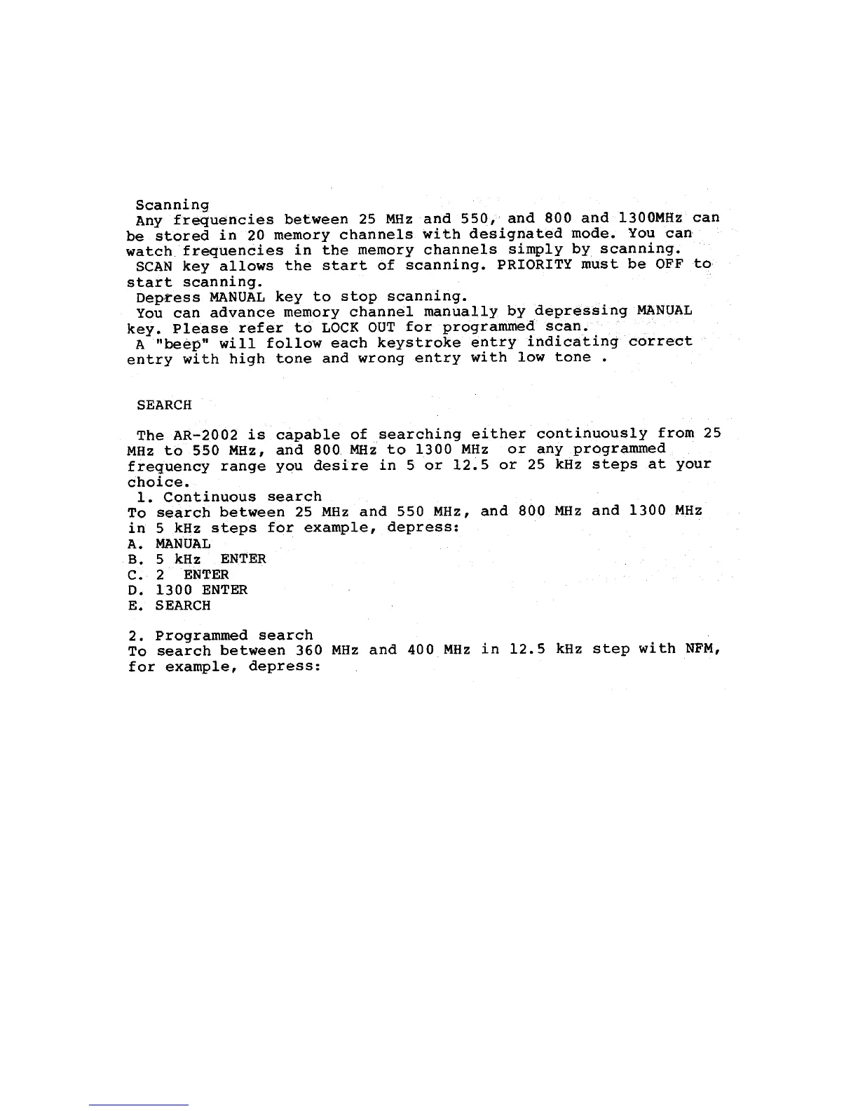 AOR AR2002 - SEARCH Function; Continuous Search; Programmed Search