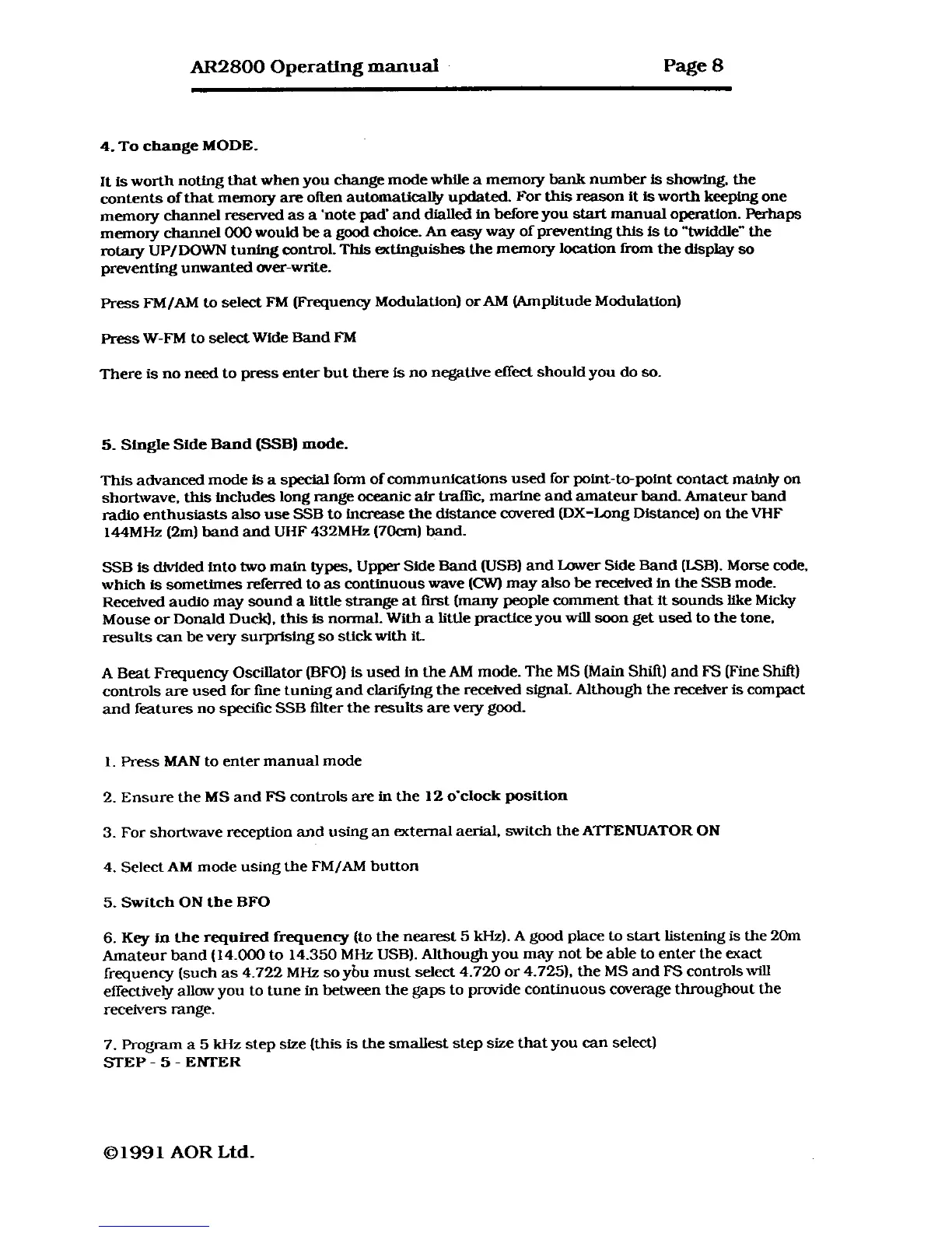 AOR AR2800 - AR2800 Manual Mode Procedures; Mode Selection and SSB Reception