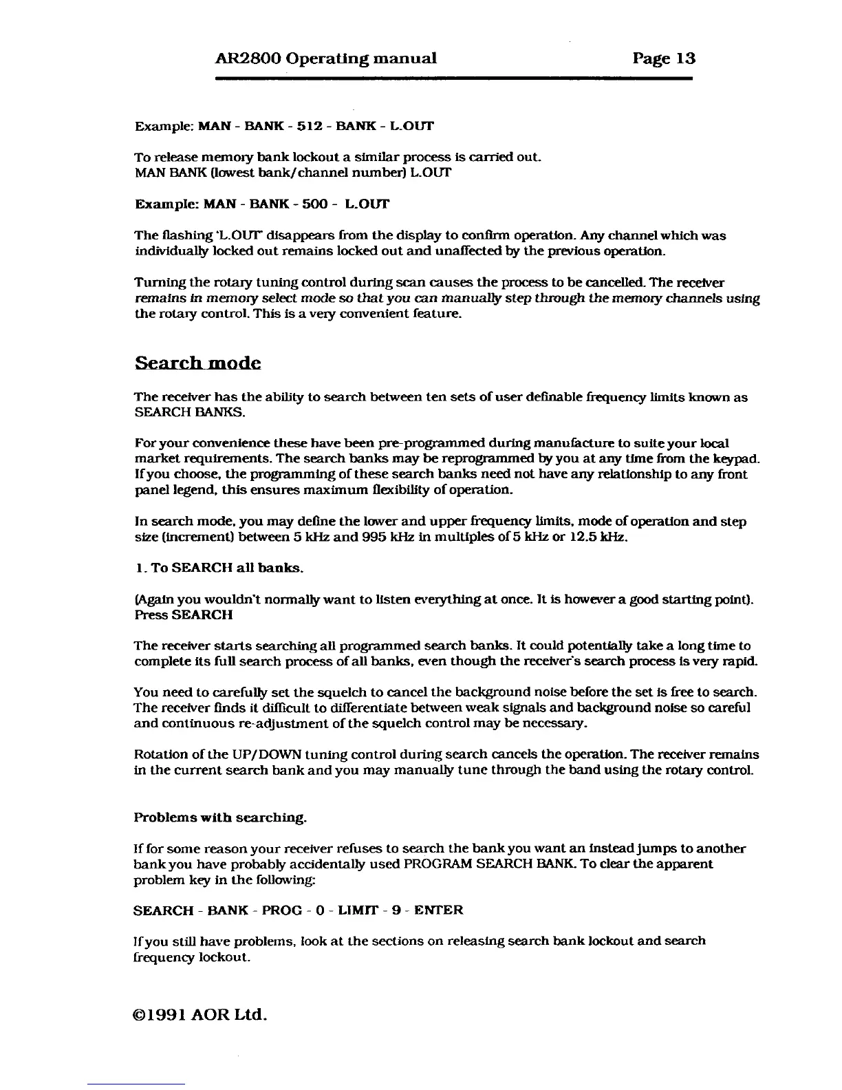 AOR AR2800 - AR2800 Search Mode Customization; Releasing Search Lockouts and Reprogramming Limits; Storing Search Frequencies to Memory