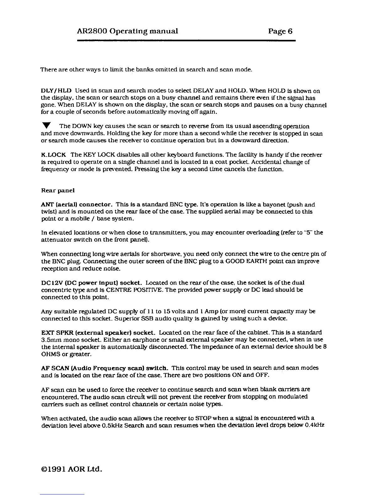 AOR AR2800 - AR2800 Advanced Operations and Connections; Scan;Search Delay and Key Lock; Rear Panel Connectors; Audio Frequency Scan (AF SCAN)