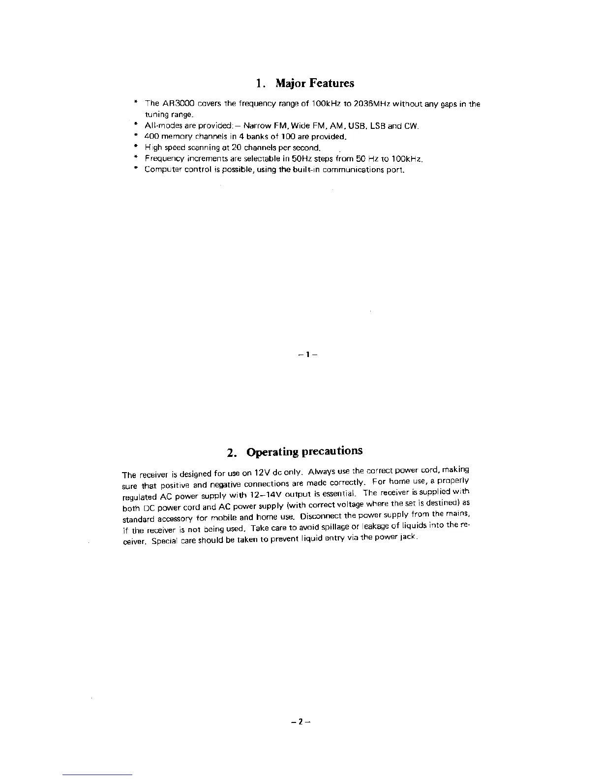 AOR AR3000 - Major Features; Operating Precautions