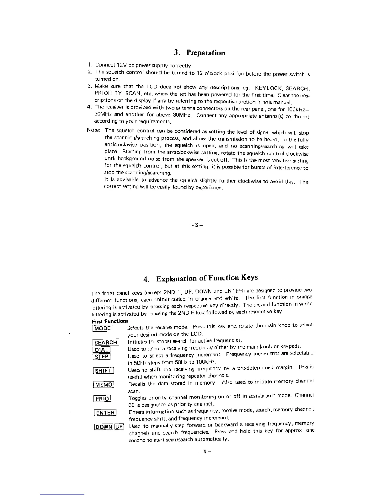 AOR AR3000 - Preparation; Explanation of Function Keys; First Functions