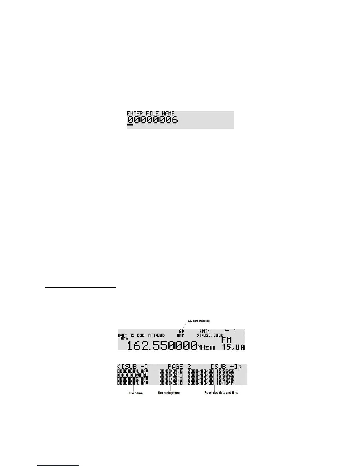 5. To change the file name, press and hold the [MHz] key for two seconds. The file name screen will