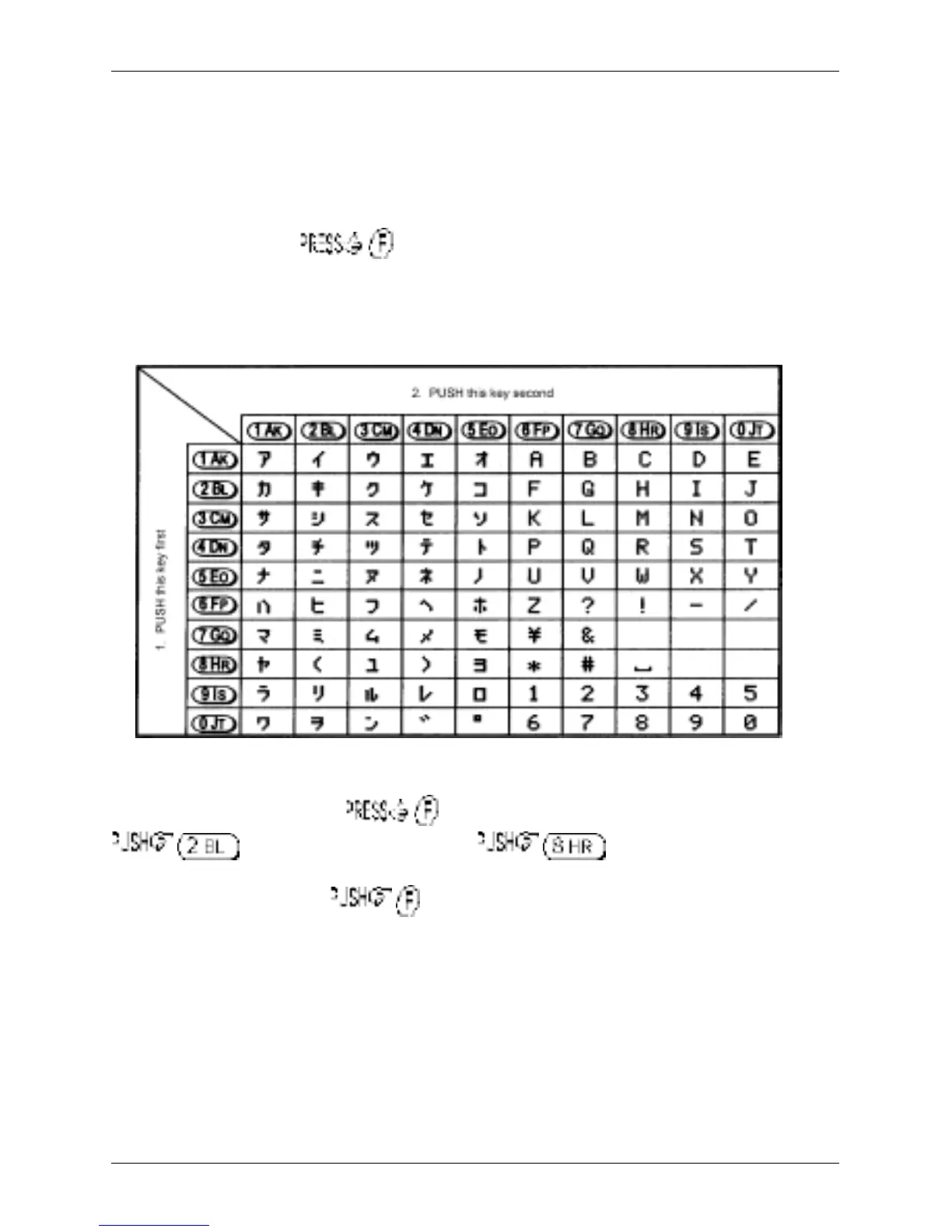 table. Look for the required character in the table then PUSH the key shown to the horizontal-left
