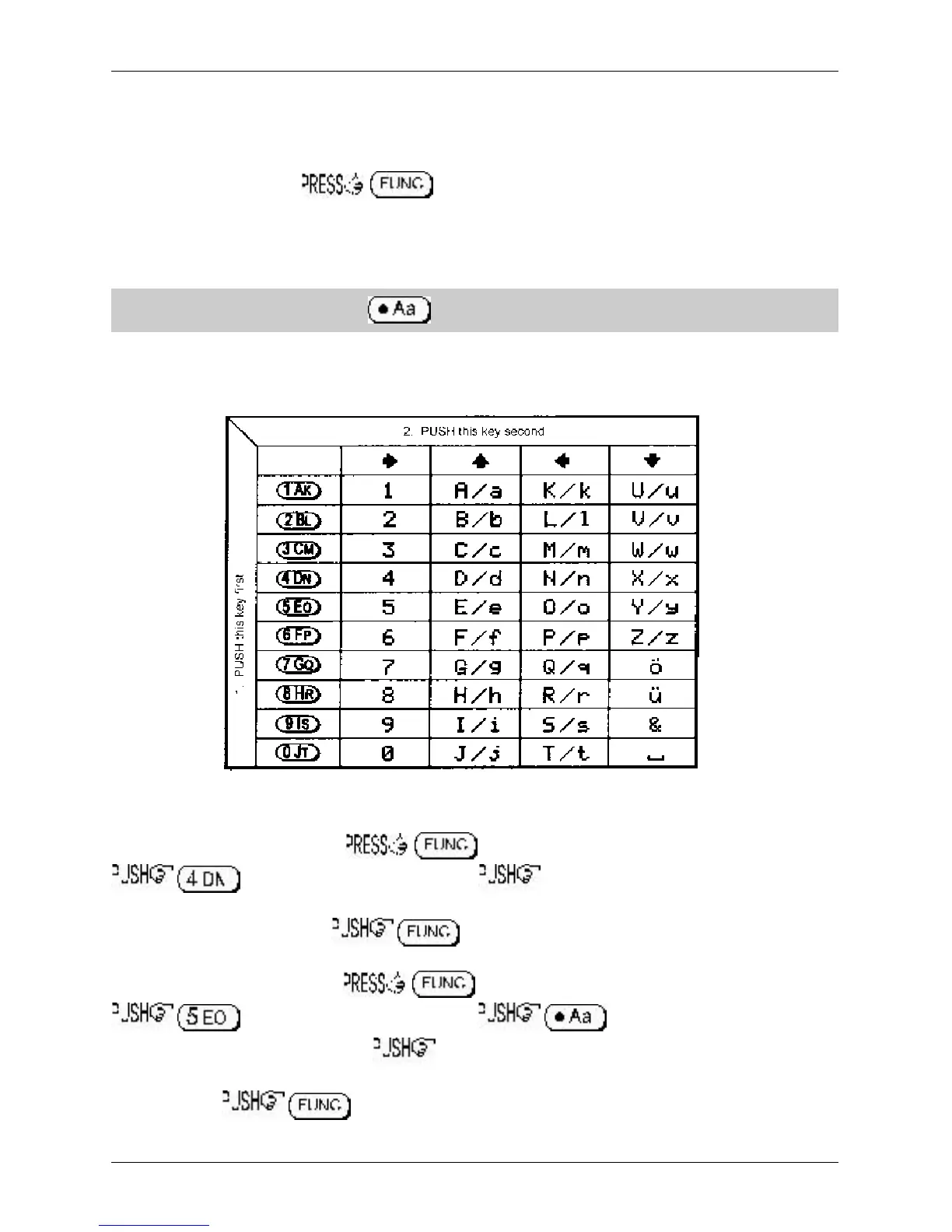 table. Look for the required character in the table then PUSH the key shown to the horizontal-left