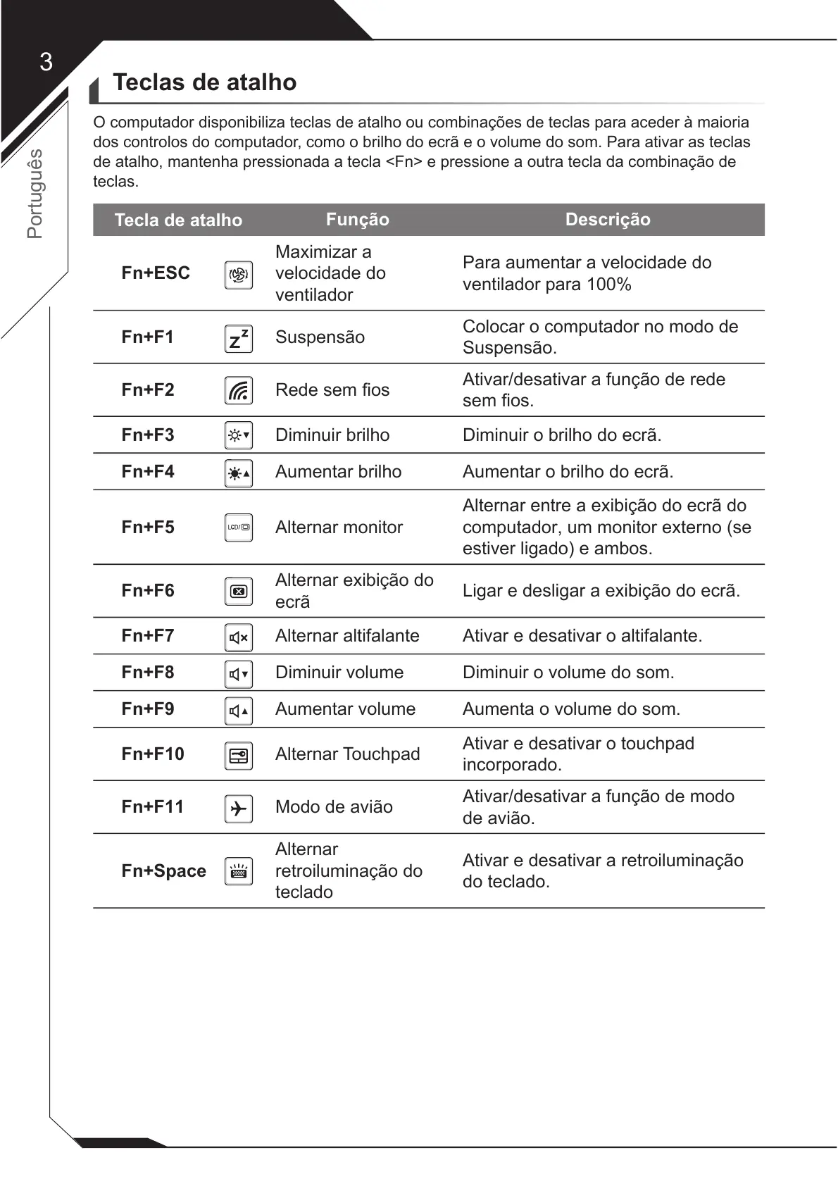 de atalho, mantenha pressionada a tecla <Fn> e pressione a outra tecla da combinação de