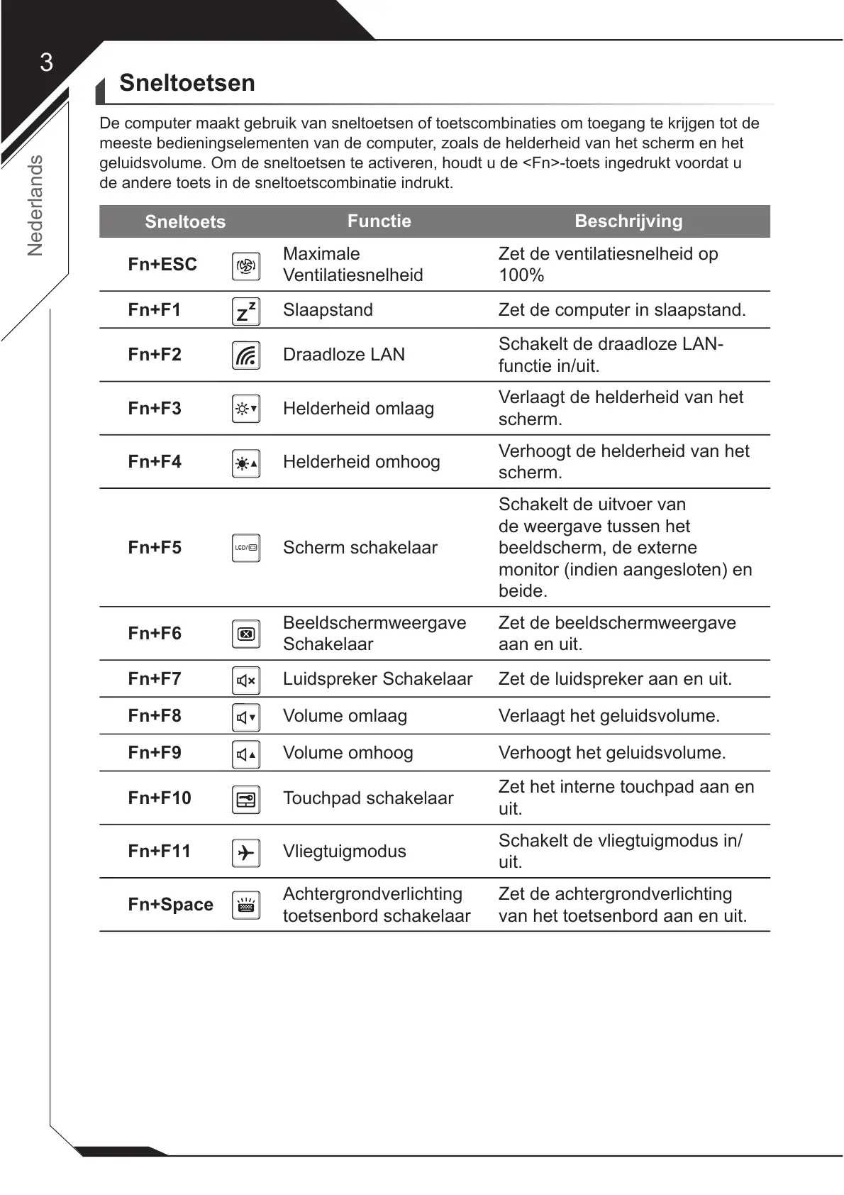 geluidsvolume. Om de sneltoetsen te activeren, houdt u de <Fn>-toets ingedrukt voordat u
