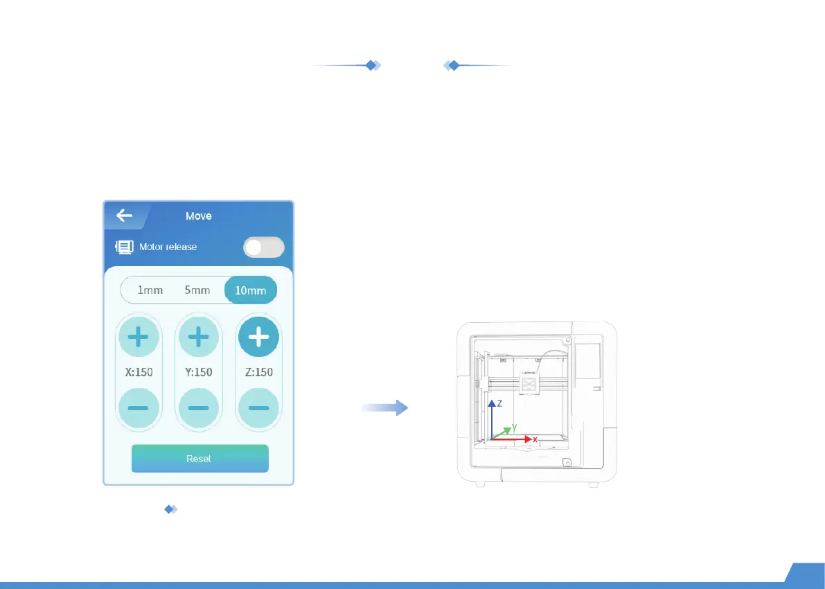 Go to "Setting -> Move -> Reset" and wait for the XYZ axes to reset. Select the moving distance: 1mm, 5mm, or 10mm.