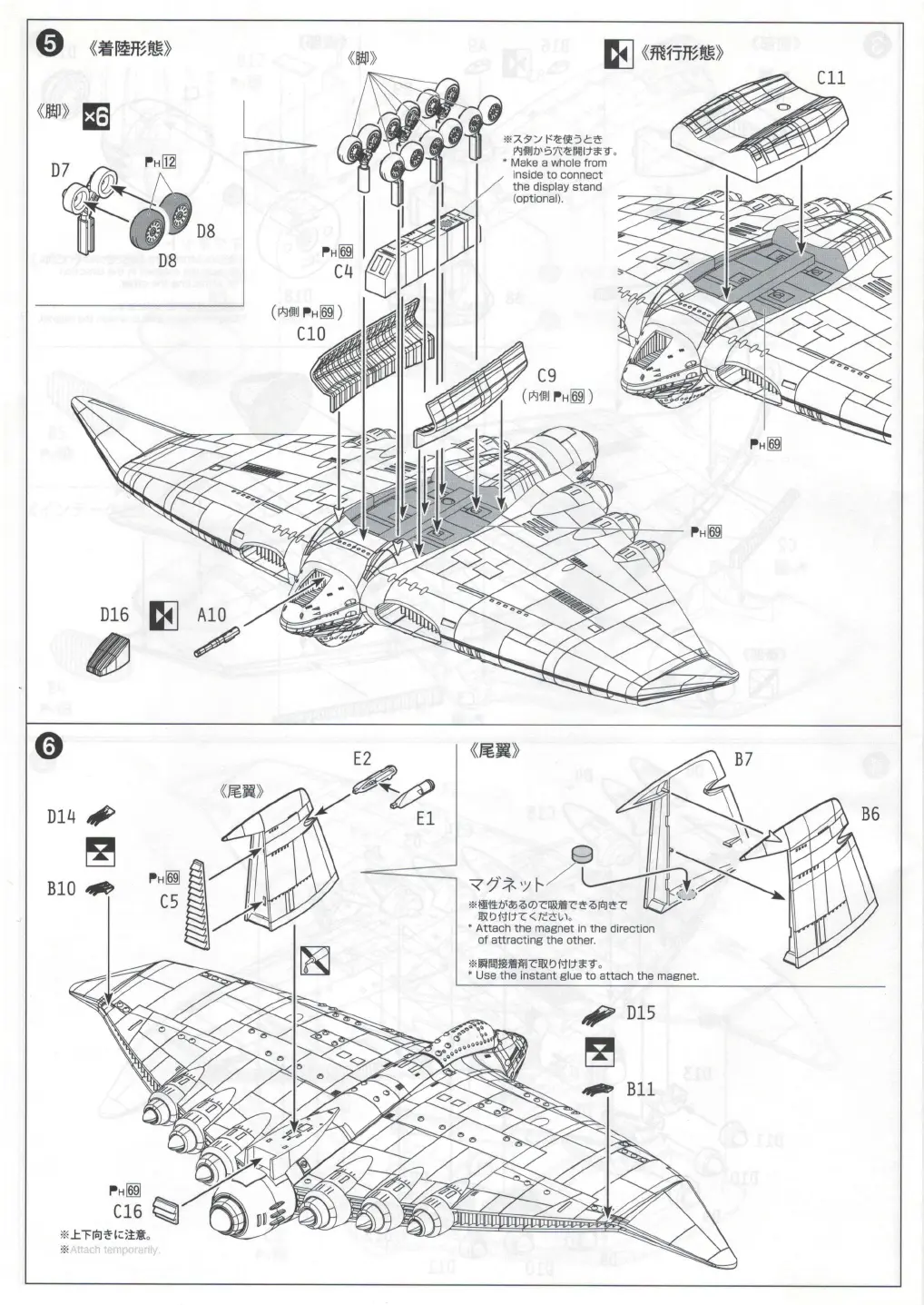 AOSHIMA 01 - Main Assembly: Landing Gear and Tail Fins; Landing Gear and Flying Form Assembly; Tail Fin Assembly