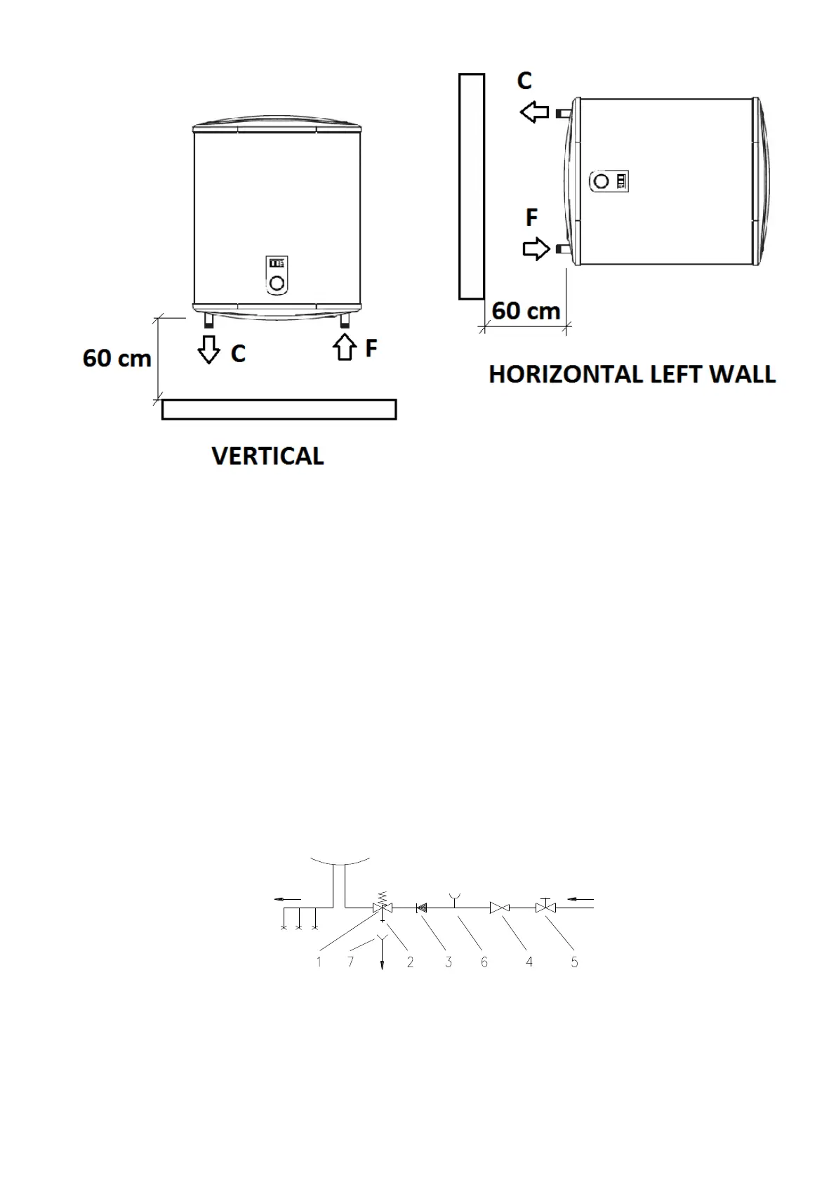 In every case the distance between water heater maintenance cover and the closer wall must be minimum 60