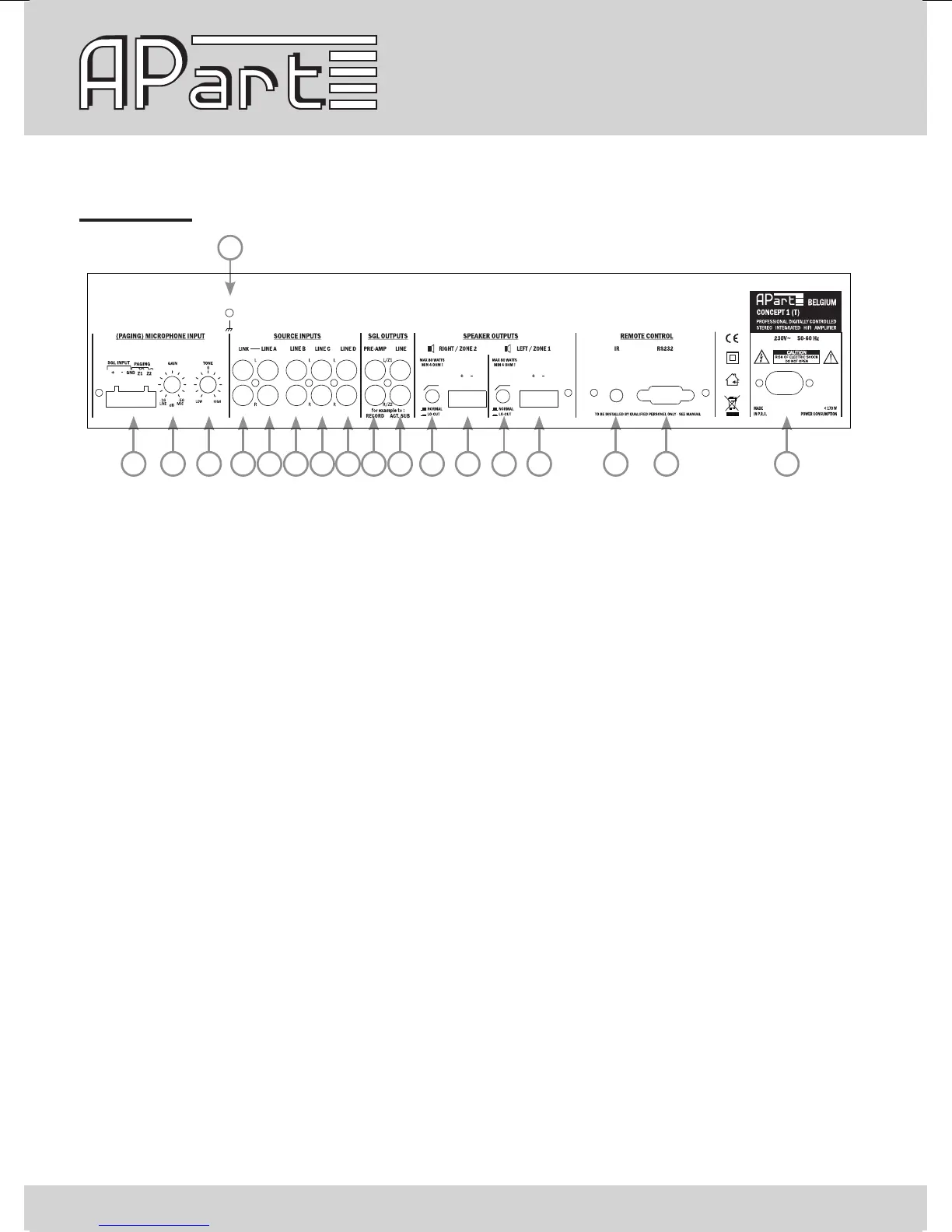1) Microphone input: connect your (paging) microphone on this euroblock connector, connect the signal