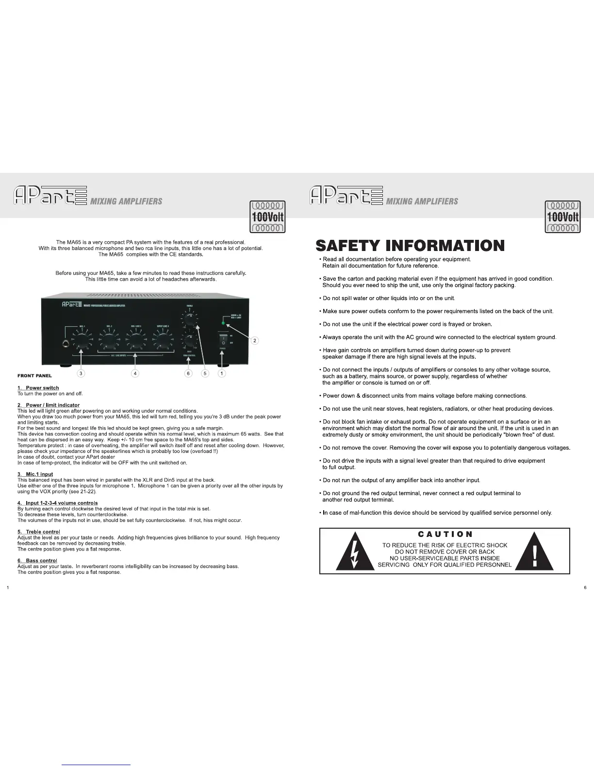 APART MA-65 - Front Panel Controls; Power Switch; Power;Limit Indicator; Mic.1 Input