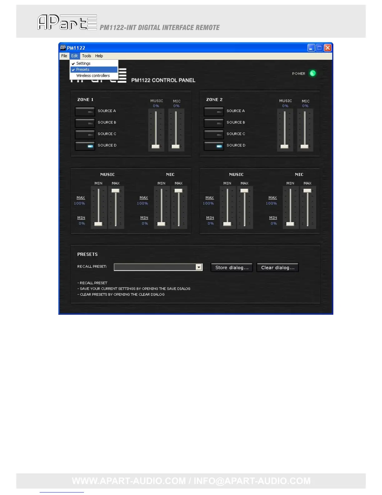 Recallingapresetcanbedonebyselectingoneinthedropdownlist.Tostoreorclear,pushthe