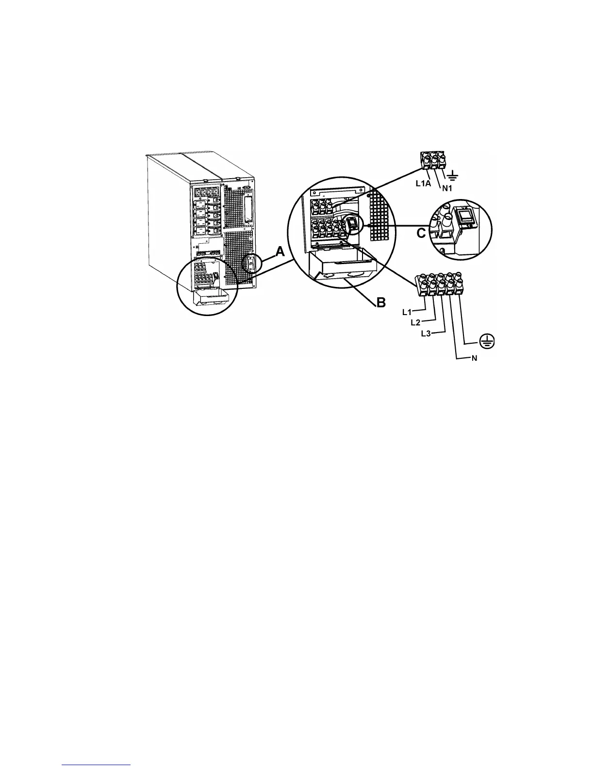 1. Switch the UPS input circuit breaker (see A in diagram) and utility circuit breakers OFF.