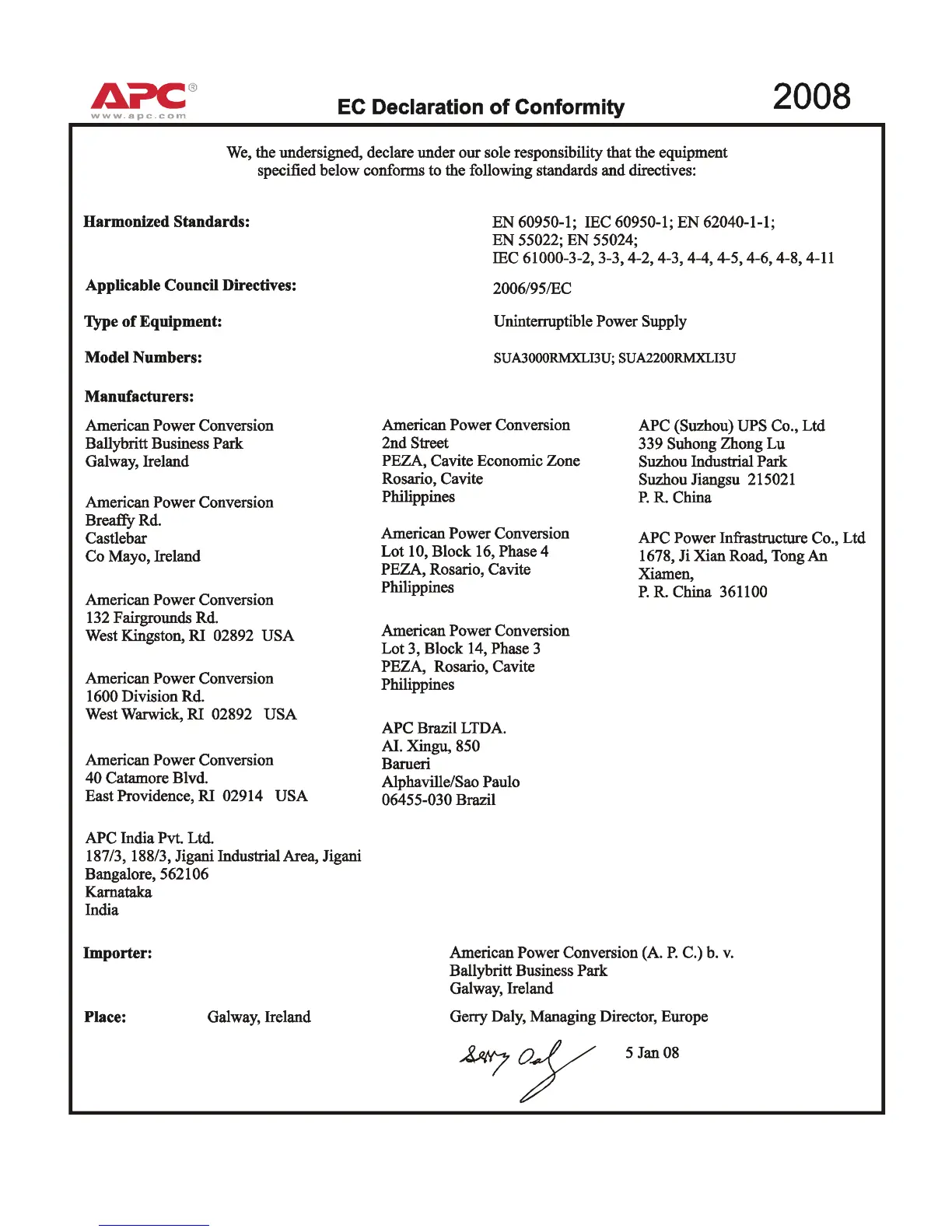APC SUA2200 - EC Declaration of Conformity; Harmonized Standards; Applicable Council Directives; Type of Equipment
