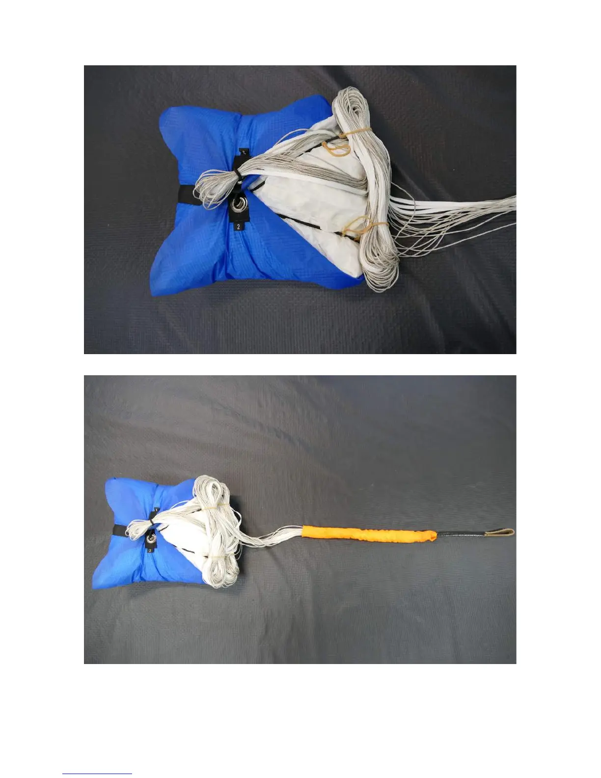 Stack and stow the lines in two bundles, using 4 aviation grade rubber bands (available from Apco), or silicon bands attached to