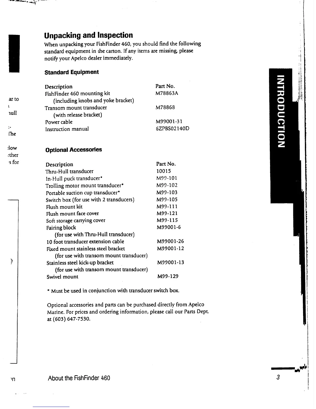 Apelco 460 - Unpacking and Inspection; Standard Equipment; Optional Accessories