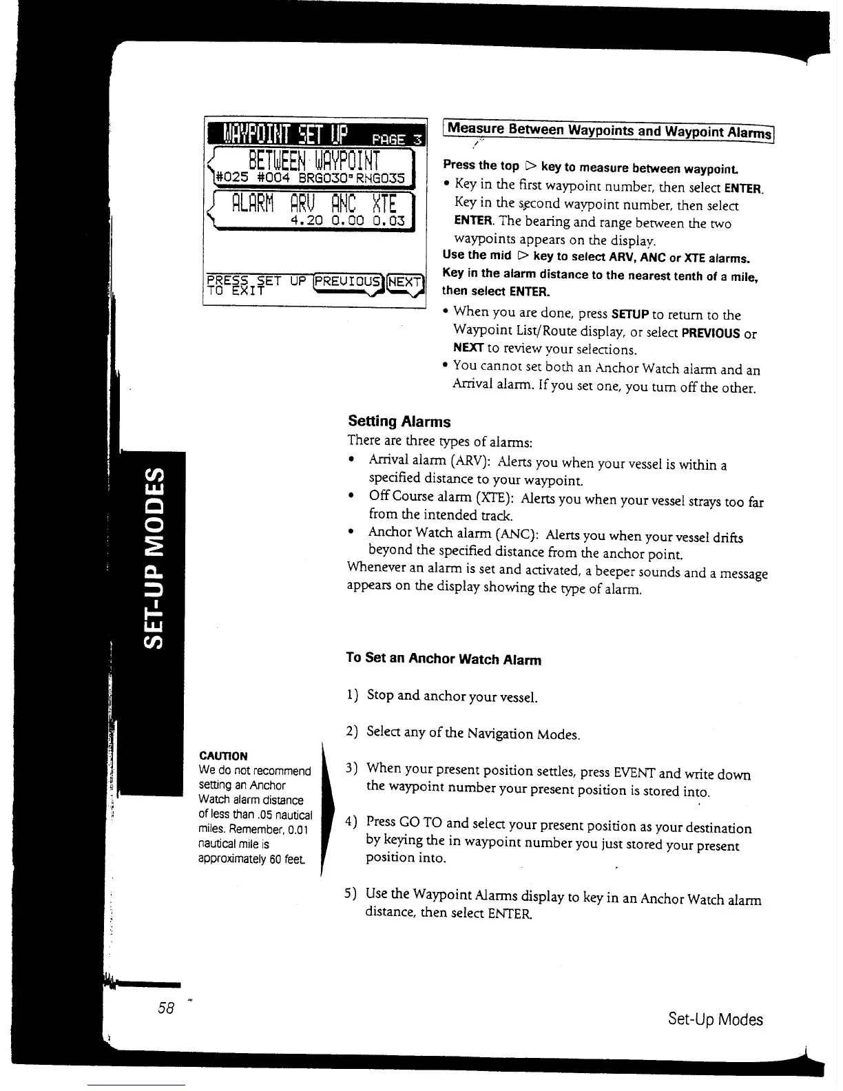 Apelco 560 - Setting Alarms; Measure between Waypoints and Waypoint Alarms; To Set an Anchor Watch Alarm