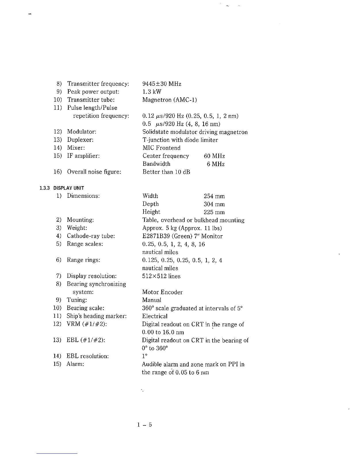 Apelco AR-16 - DISPLAY UNIT SPECIFICATIONS