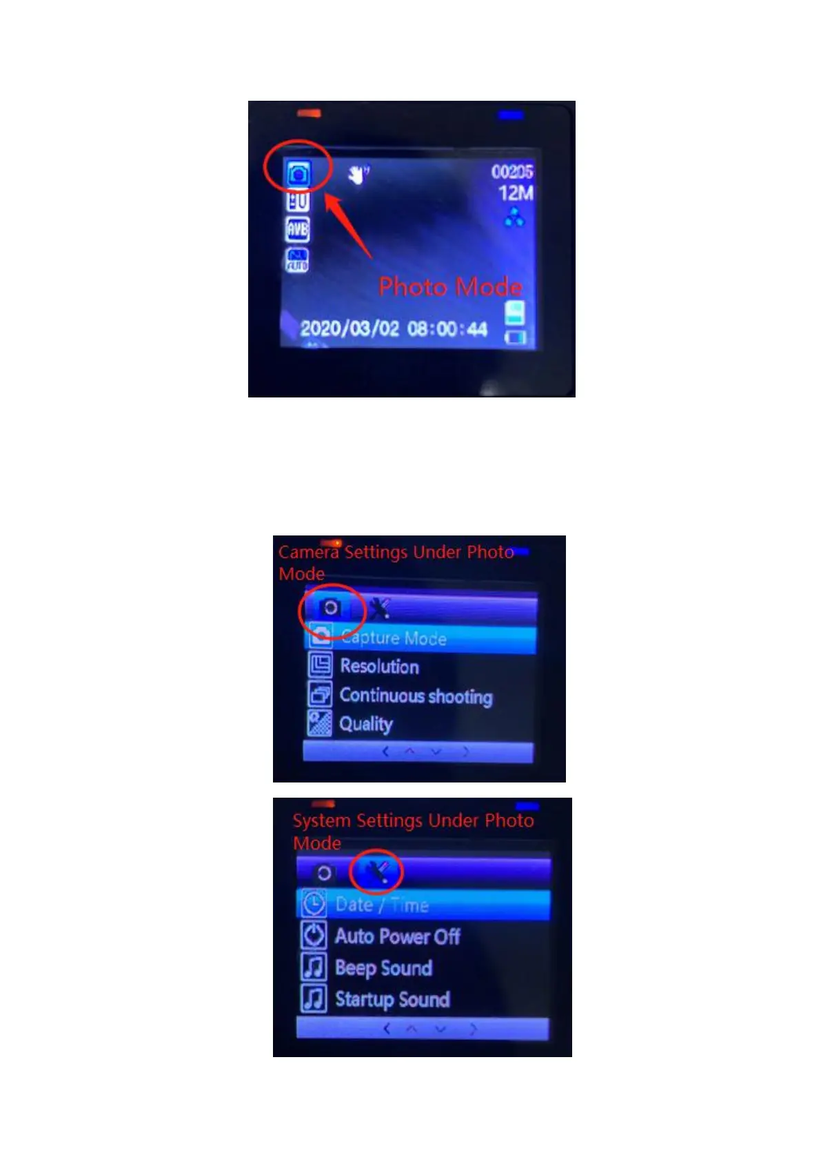 Under the Photo mode, short press the MENU button to enter its