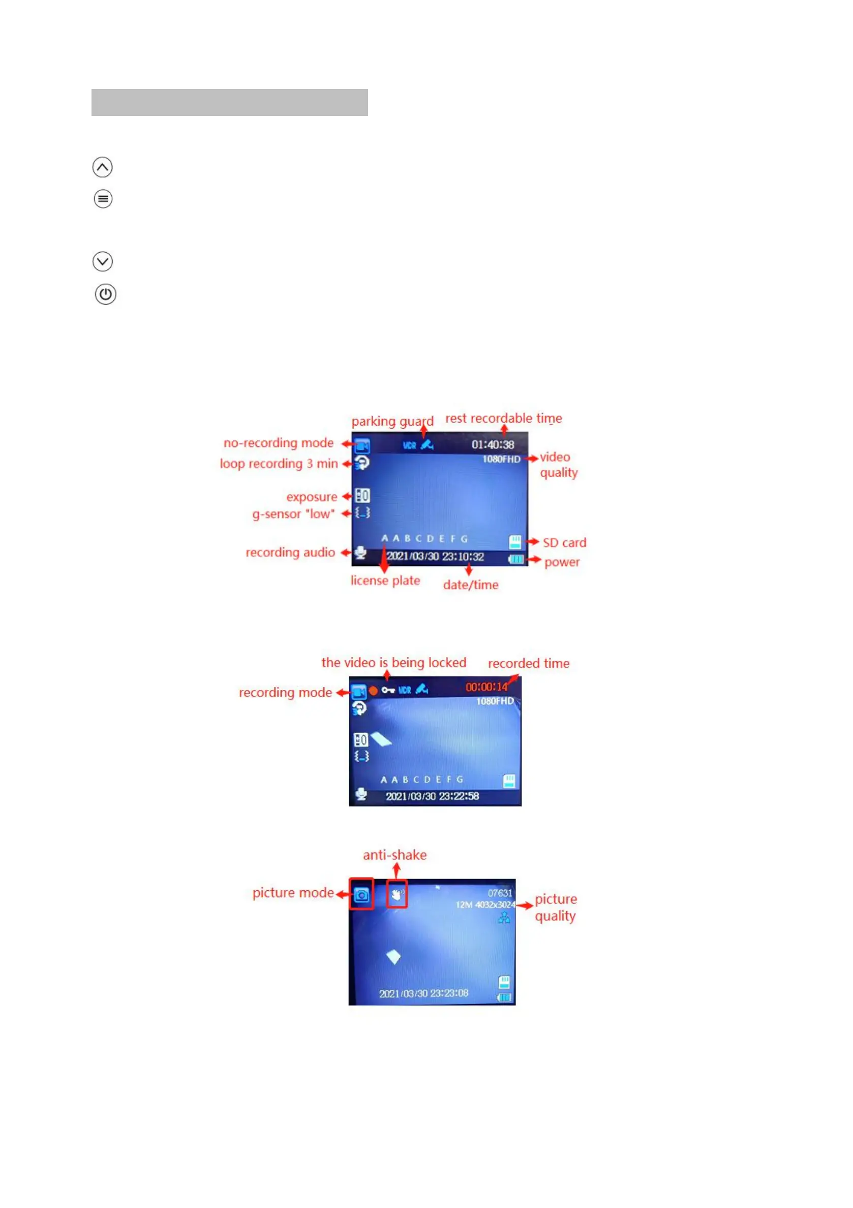 Menu button; Lock button (lock the video if you press it during recording);Back button (return to