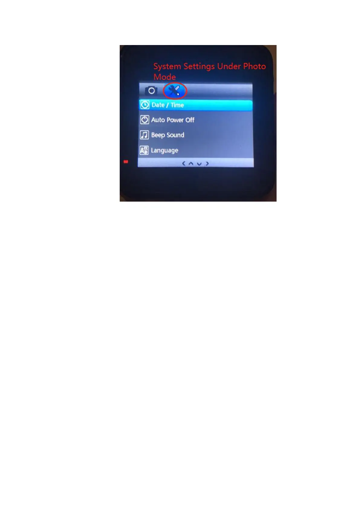 Under the Photo mode, long press the MENU button to access to the