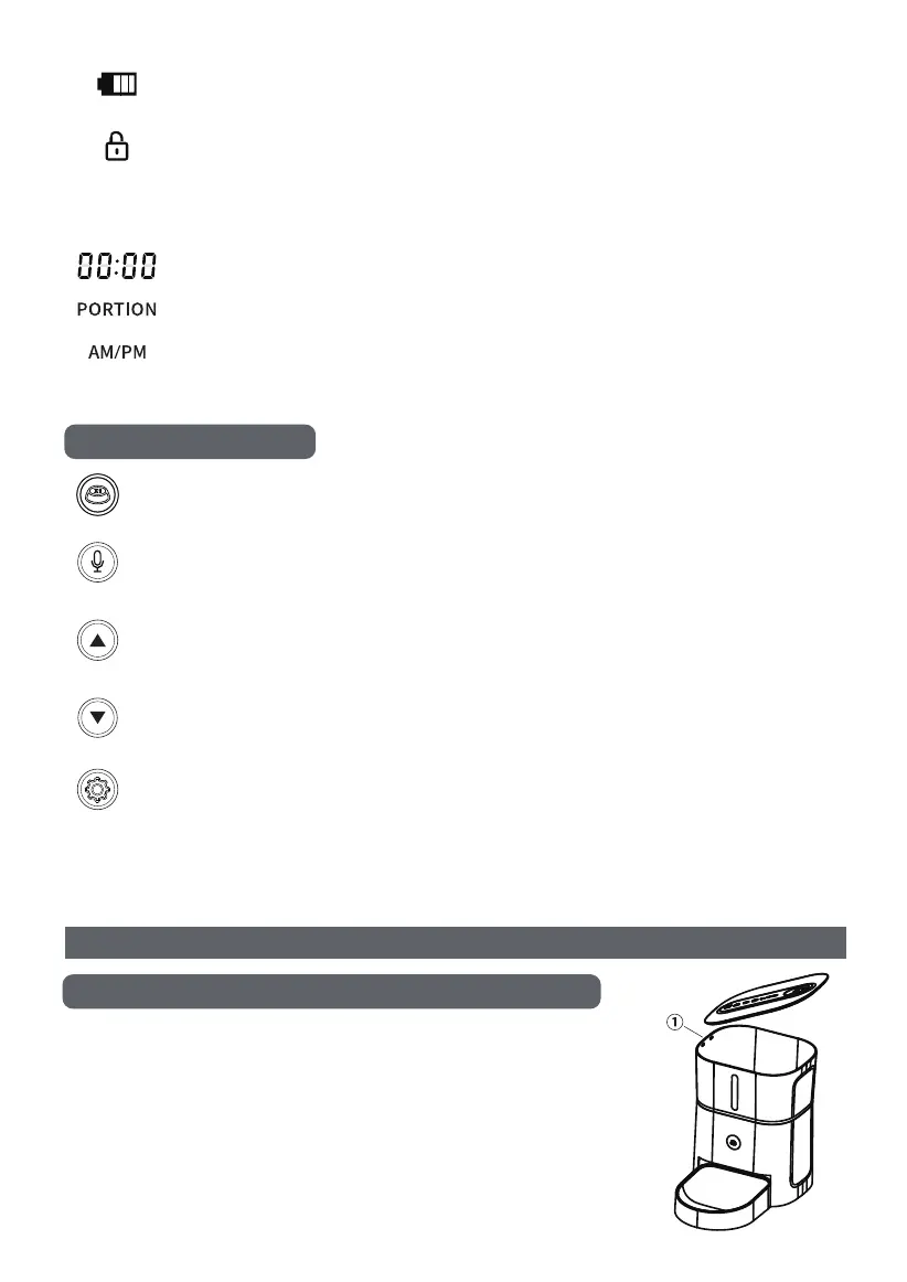 Down/Unlock button: Set the clock and feeding time; also serves as an unlock button.