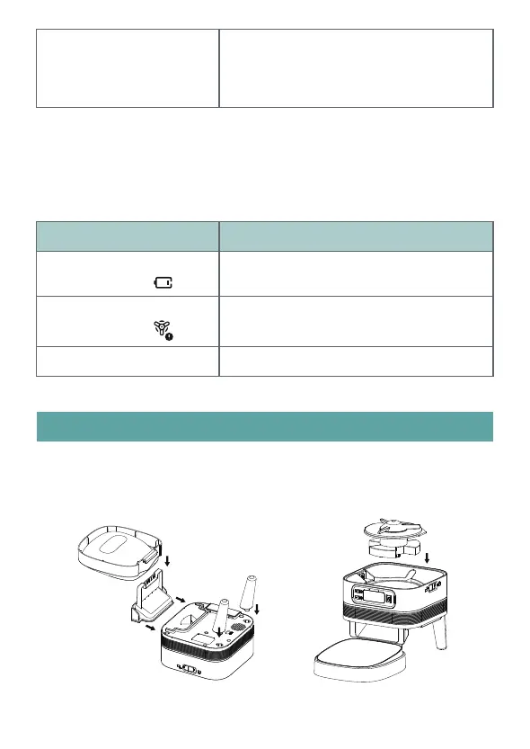1. Attach supporting feet, food outlet, bowl tray and feeding rotating shaft to