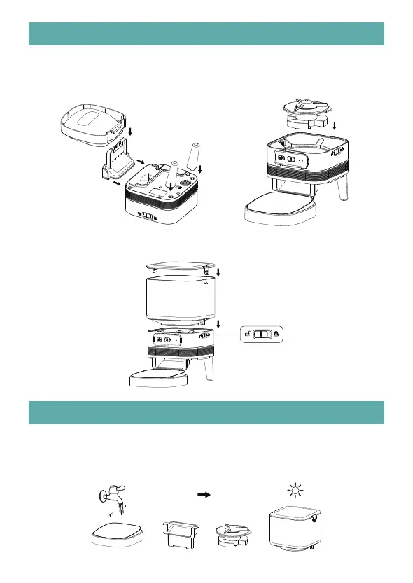1. Attach the supporting feet, food outlet, bowl tray and the feeding rotating