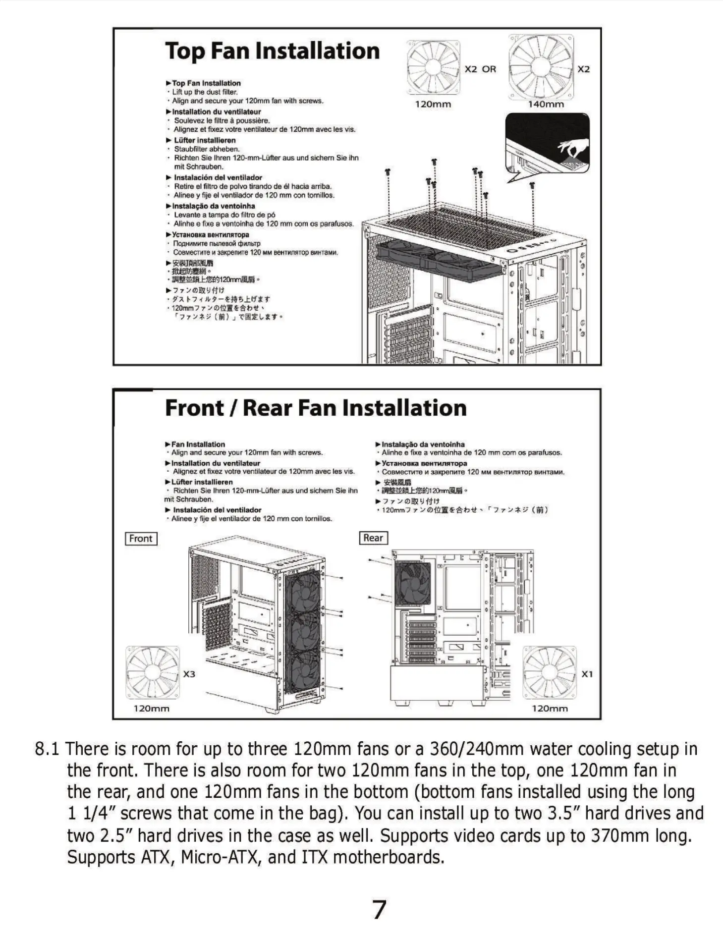 8.1 There is room for up to three 120mm fans or a 360/240mm water cooling setup in