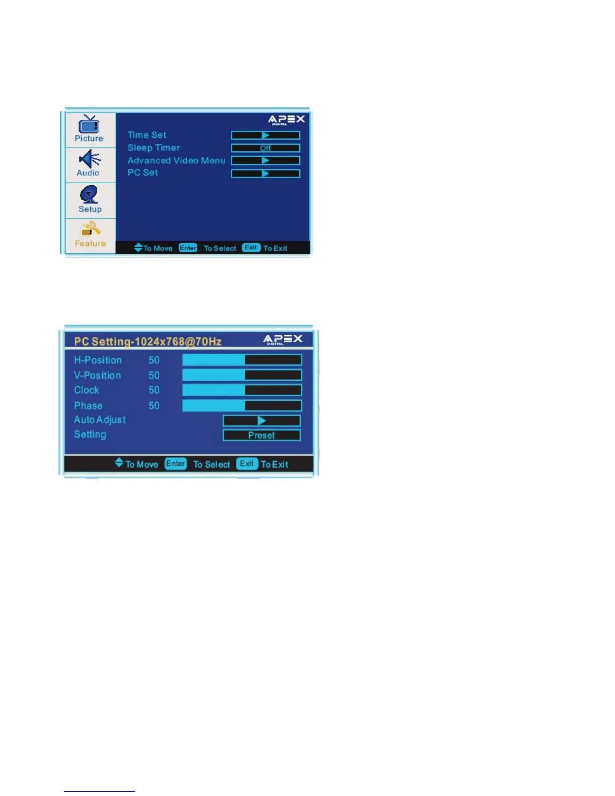 Presione el botón ENTER/► para restaurar la configuración PC a los valores predeterminados de fábrica.