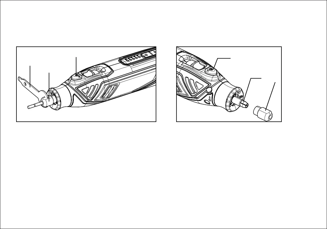 Avec le blocage de la broche (A) engagé, serrez l'écrou de la pince de serrage (D) avec la clé fournie (E) jusqu'à ce que la tige de l'accessoire