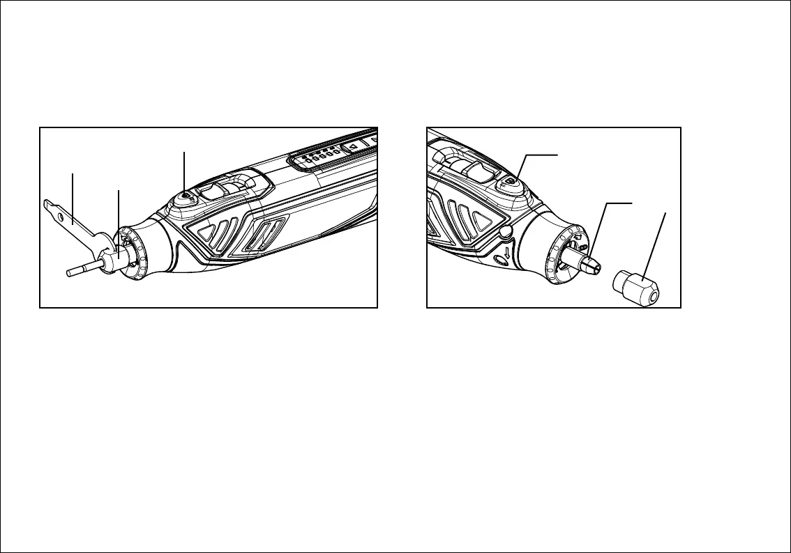 Con el bloqueo del eje enganchado, utilice la llave de boquilla (E) para aflojar la tuerca de la boquilla (D), si es necesario.