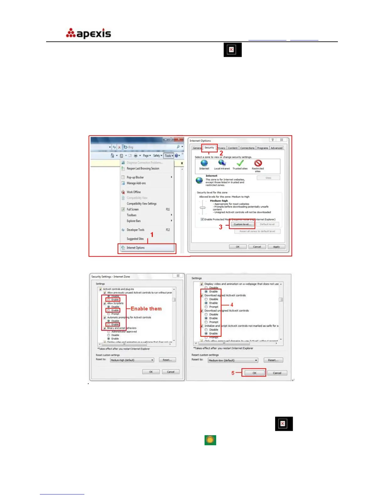 2. Change the ActiveX settings, “IE” browser > “Tool” > “Internet Options” > “Security”> “Custom Level” >