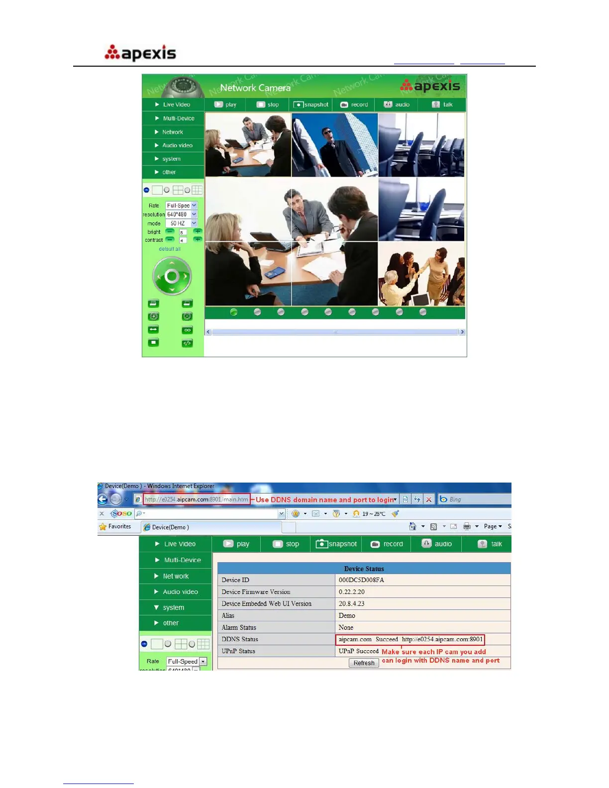 Login the first camera by DDNS domain name and port, this camera will be as the host camera.