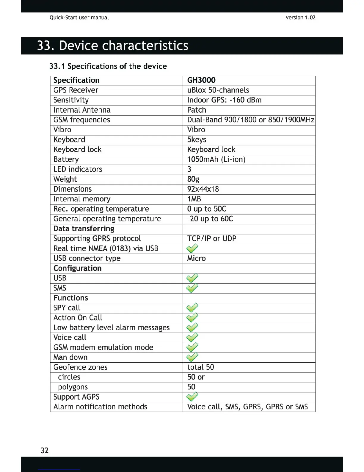 Apexs GH3000 - 33. Device Characteristics; Device Specifications and Battery Life