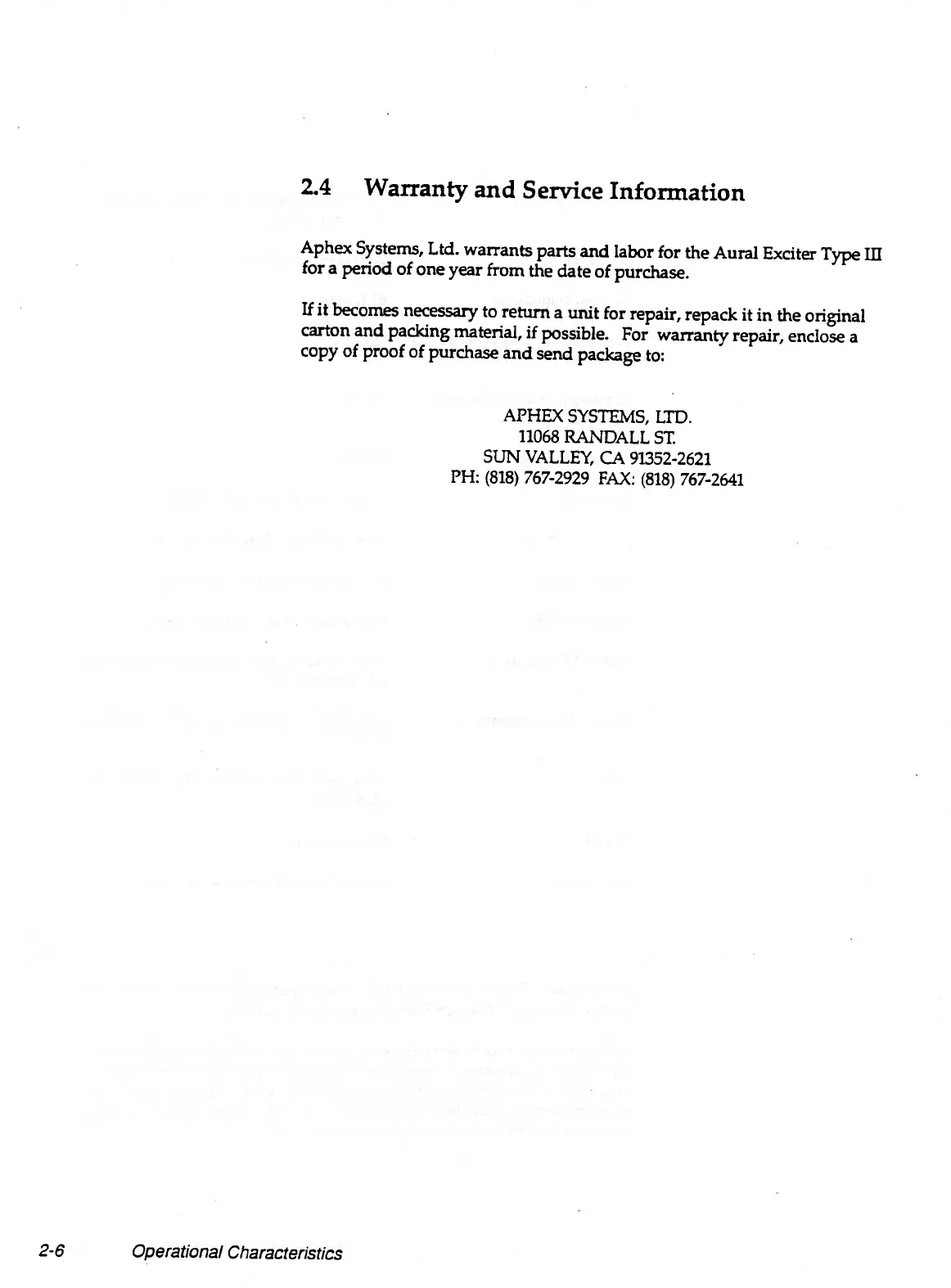 Aphex Systems, Ltd. warrants parts and labor for the Aural Exciter Type ID