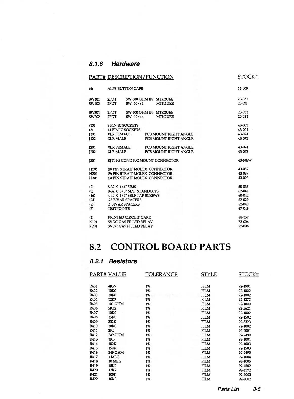 8.2 CONTROL BOARD PARTS