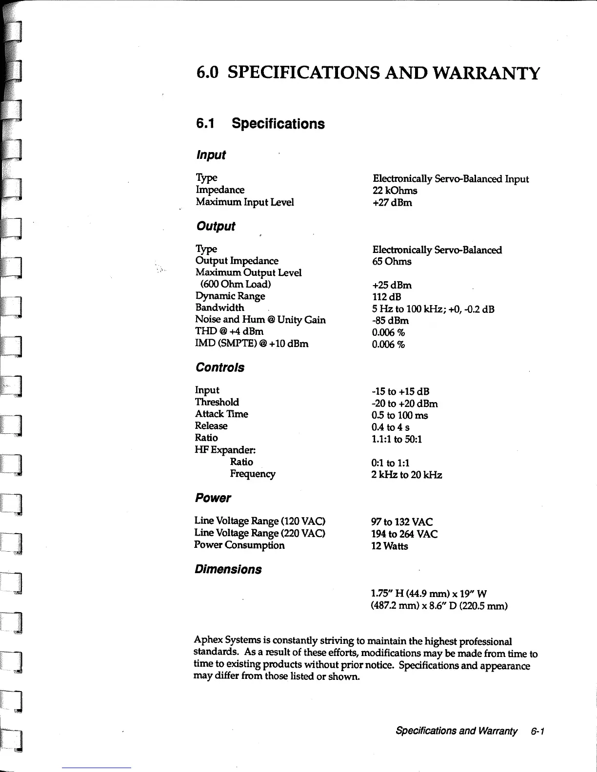 Aphex 651 Expressor - 6.0 Specifications and Warranty; 6.1 Technical Specifications
