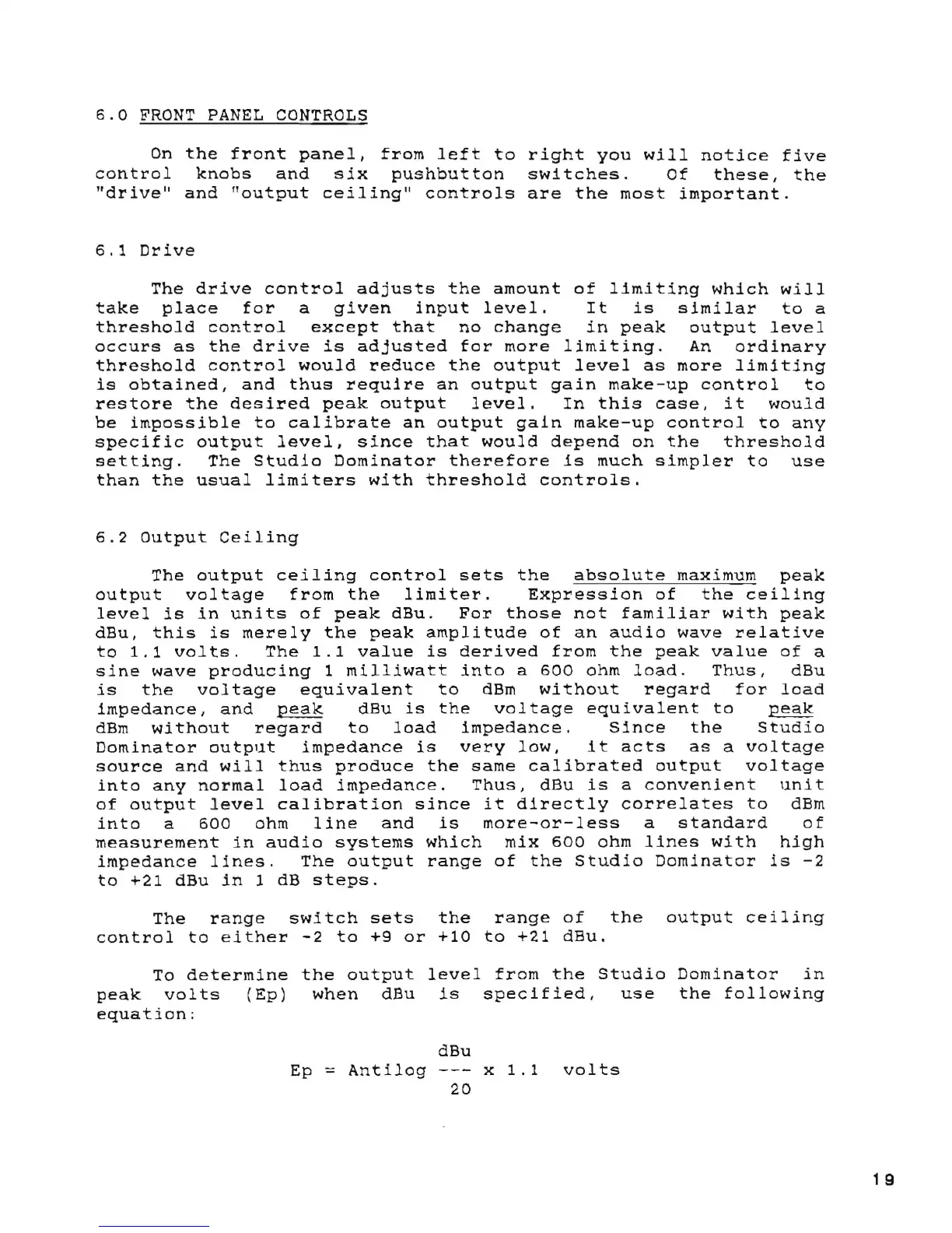 Aphex Studio Dominator 700 - 6 0 Panel; Front Panel Controls; Drive; Output Ceiling