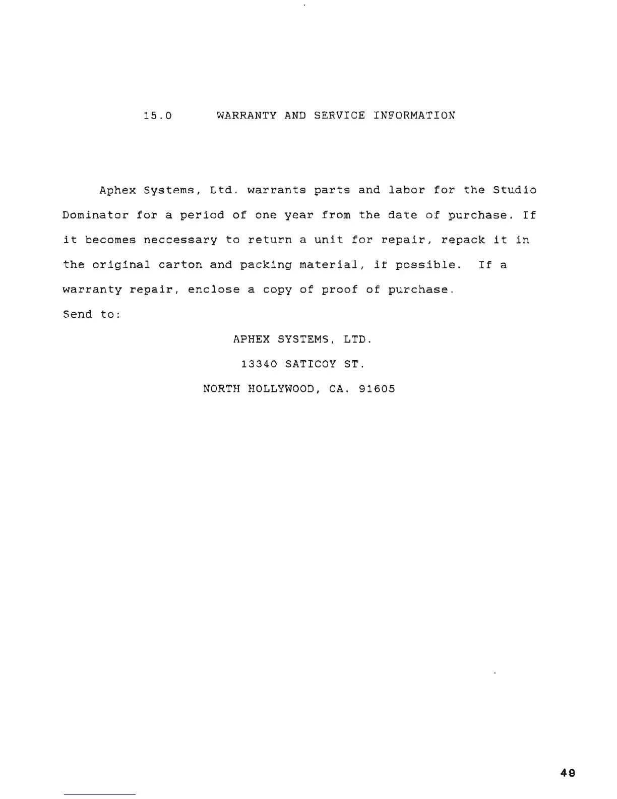 Aphex Studio Dominator 700 - 15 WARRANTY and SERVICE INFORMATION
