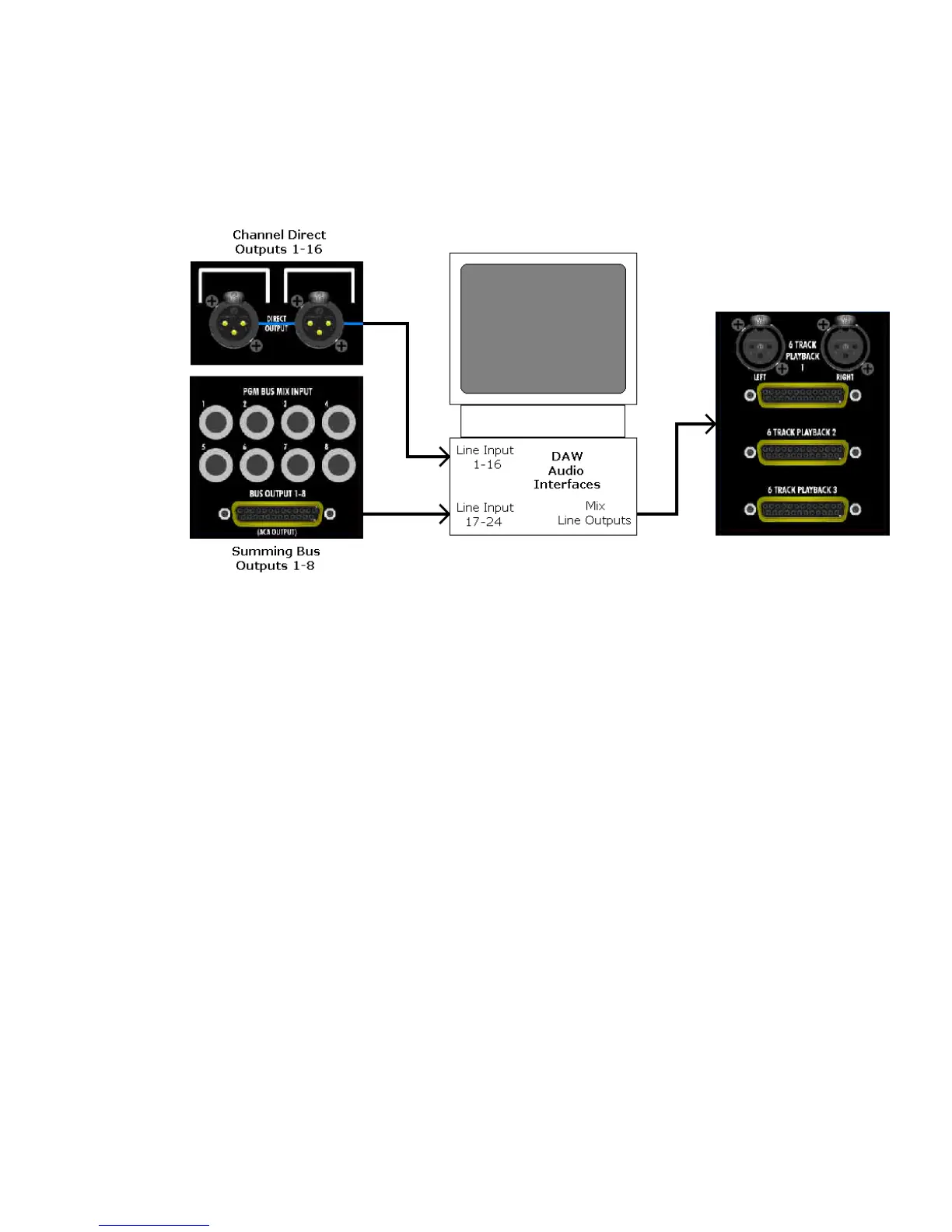 The diagram below shows the connections as above, except the mix return from the DAW is