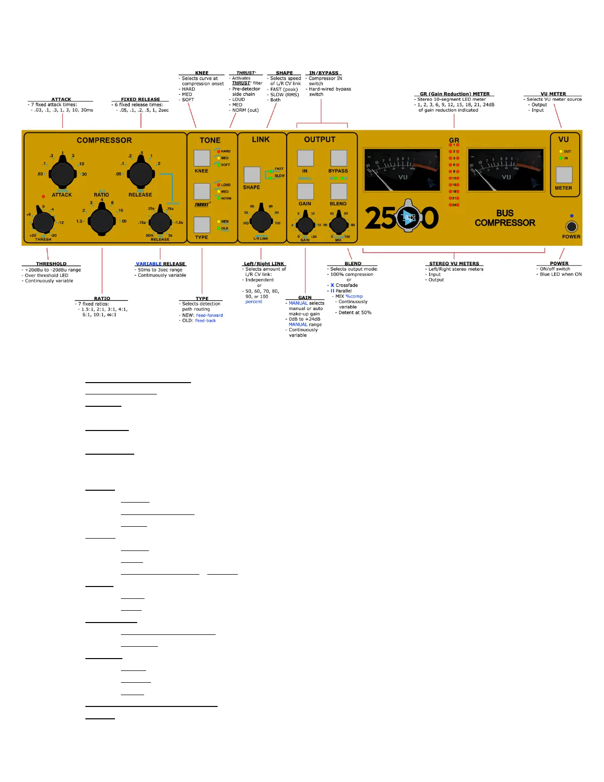 • GAIN: MANUAL make-up gain control (0dB to +24dB of output gain when MANUAL is engaged)